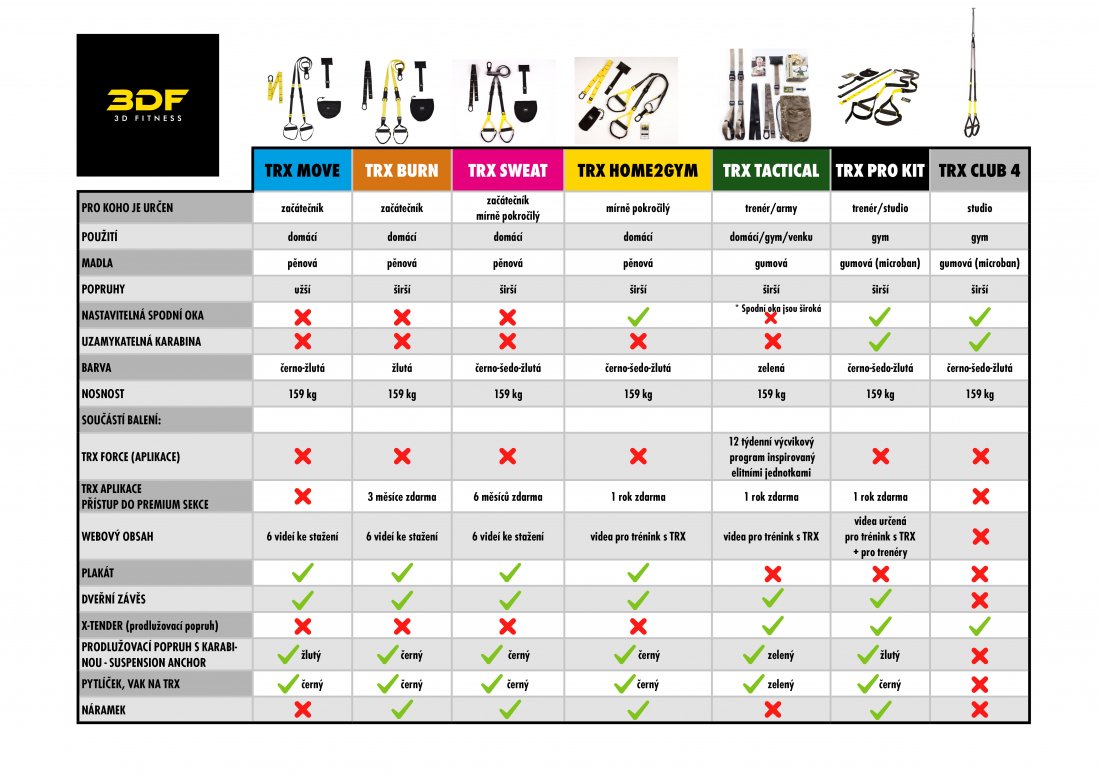 Společnost 3D FITNESS je oficiálním a výhradním distributorem značky TRX pro Českou republiku i Slovensko. Jedním z nejčastějších dotazů, které nám často zákazníci pokládají při výběru jejich nového TRX závěsného systému se tyká rozdílů mezi jednotlivými TRX a který z nich si vlastně vybrat.